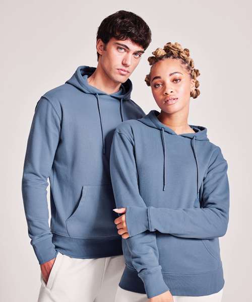 Soft hand feel. Double-fabric hood. Brushed inner fleece. Nickel-free, colour-matched eyelets and drawcord ends. Twin-needle detail. Cut and sew 1x1 ribbed cuffs and hem. Kangaroo pocket. Self-coloured neck size label.