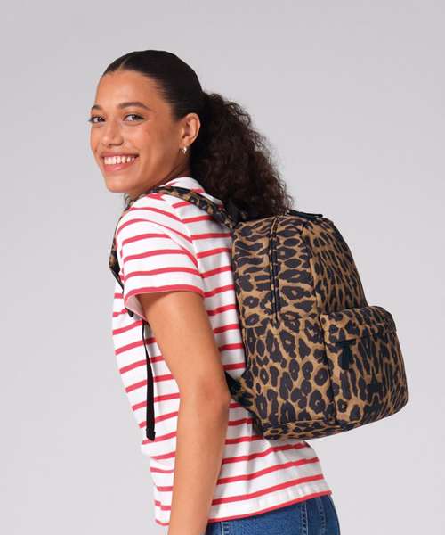 Leopard print design. Zipped front pocket. Side pockets. Padded back panel. Padded, adjustable shoulder straps. Grab handle. Tear-away label for ease of rebranding. Contains 100% GRS-certified recycled polyester, certified by Control Union CU811033.