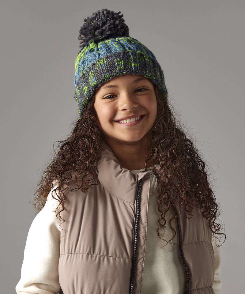 Tear-out label for ease of rebranding. Cuffed design for optimal decoration. Heavyweight multi yarn cable knit design. Luxurious shearling thermal band for extra warmth. Bold four colour stripe design. Available in adult sizes.