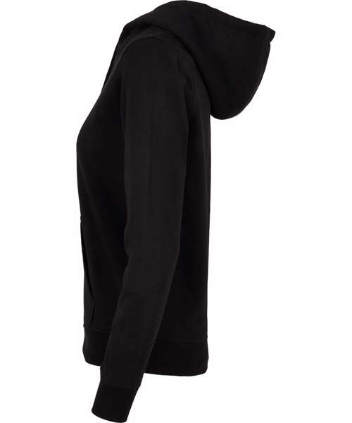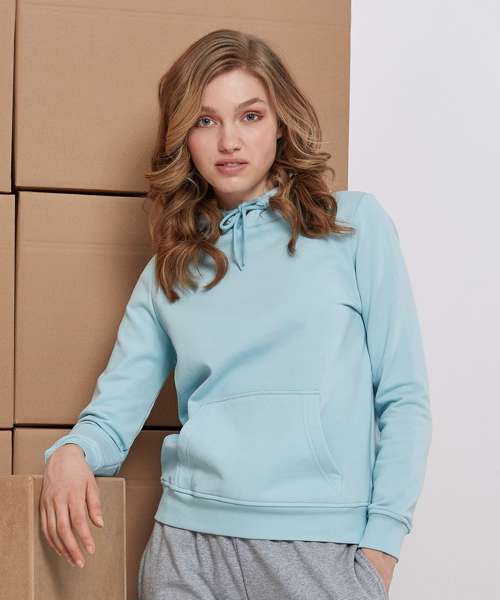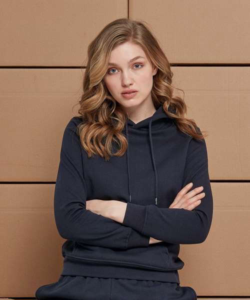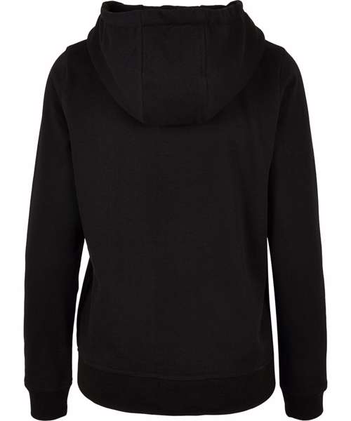 Classic cut and comfortable basic hooded sweatshirt for women. Hood, kangaroo pocket and wide cuffs on sleeves and hem provide the necessary comfort. The hooded sweatshirt is perfectly suited to be refined and can be easily customised.