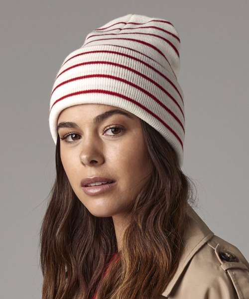 Contains 100% certified recycled polyester. Classic stripe design. Double-layer knit. Wide cuffed design for optimal decoration. TearAway label for ease of rebranding.