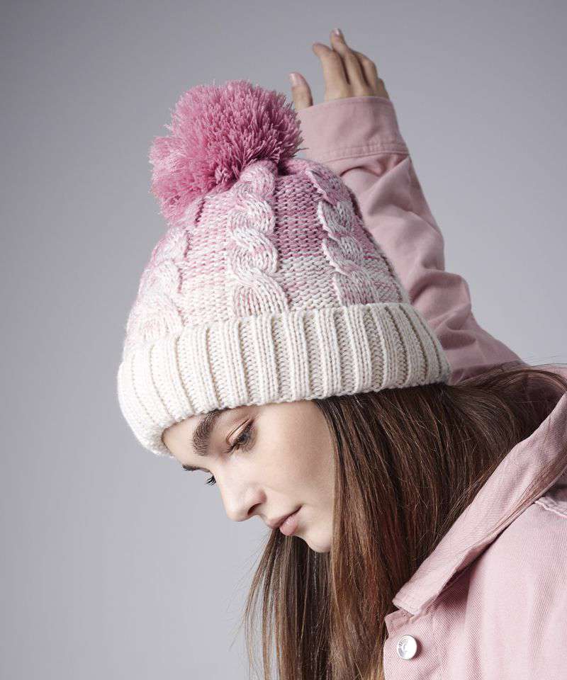 Cuffed design for optimal decoration. Heavyweight multi yarn cable knit design. Self-coloured pom pom.