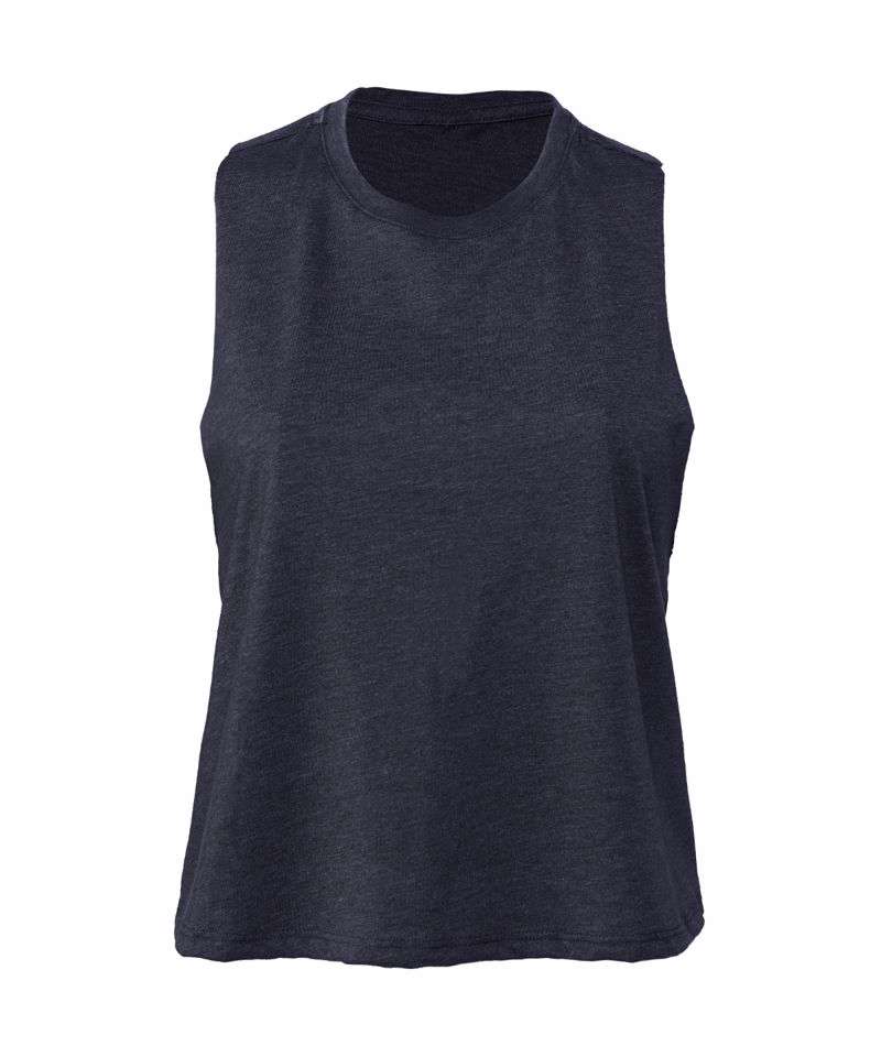 Side seamed. Relaxed, cropped fit. Racerback. Raw edge arm holes.