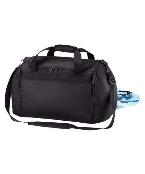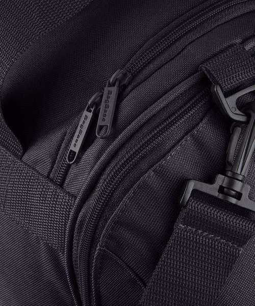 Detachable adjustable shoulder strap with pad. Zippered end pockets. Padded hand grip.