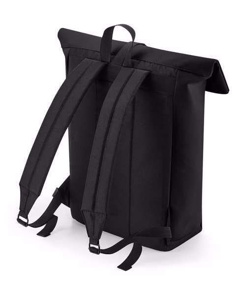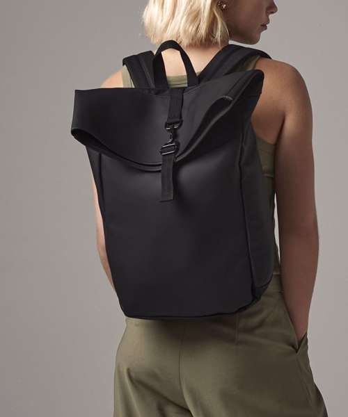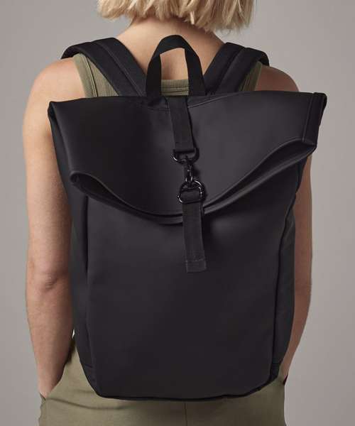 100% Recycled polyester with matte-look PU coating. PVC-free. Water-repellent fabric. Padded internal laptop sleeve, compatible up to 15.6". Minimalist styling. Zipped front pocket. Double-layer base panel for durability. Roll-top closure. Secure clip closure. Padded adjustable shoulder straps. Grab handle. TearAway label for easy rebranding.