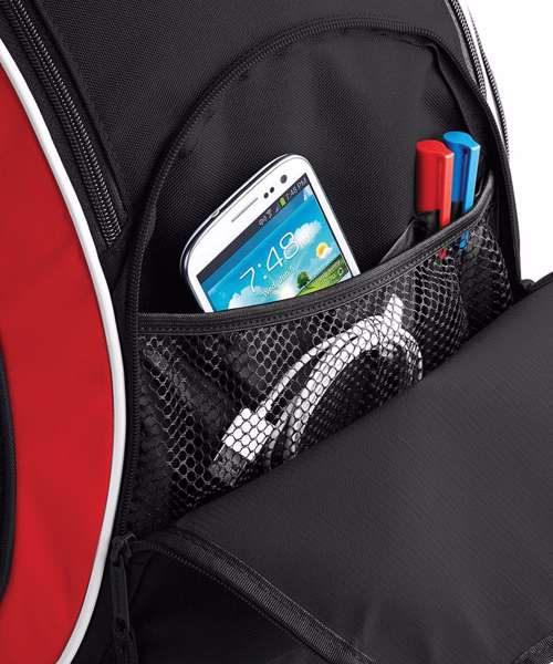 - Padded adjustable shoulder strapsMedia pocket and headphone portWater bottle pocket