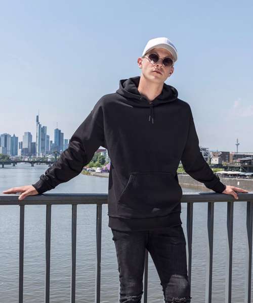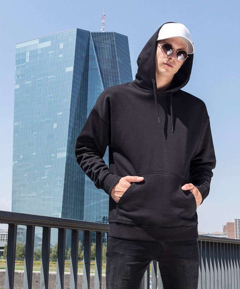 The oversize hoody combines classic sportswear with cool details: the soft sweatshirt material and the drop-shoulders ensure a casual fit. The broad ribbed cuffs with open edges, the kangaroo pocket and the hood with matching drawstring ensure the perfect urban look – with or without print. This item is manufactured in a FAMA Certified factory. FAMA stands for Facility and Merchandise Authorisation and is a high standard production certificate.