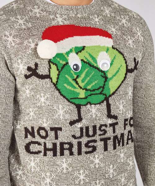 This is a brilliant novelty jumper for fans of the humble Brussel sprout. A bright and colourful cheeky sprout face with Santa hat with white pom-pom, with caption 'Not just for Christmas'. It's sure to be family favourite. .