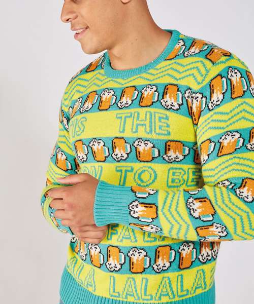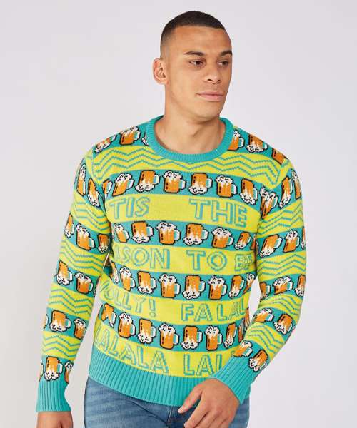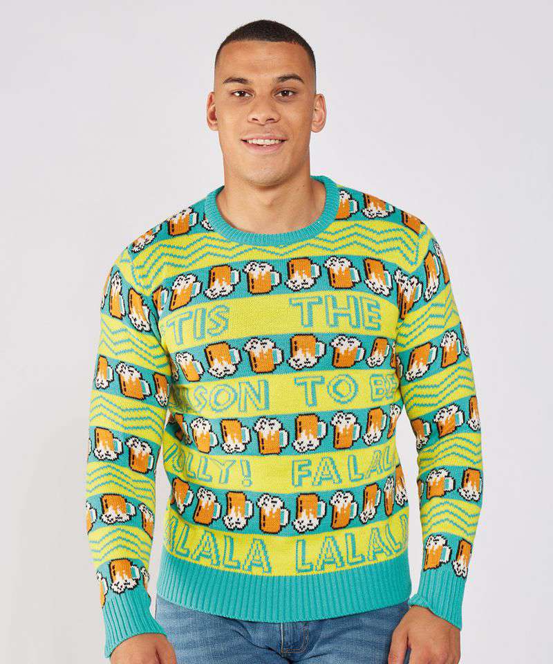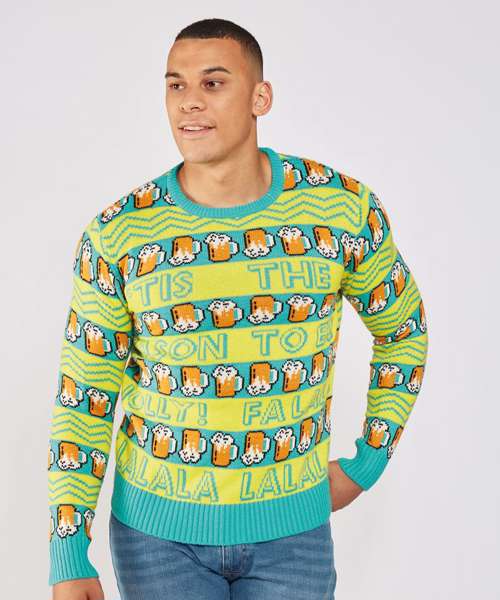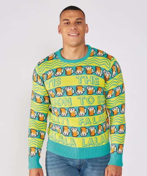 Unisex sizing. Yellow/Green theme with all-round repeated pattern of beer glasses. Seasonal message on the front 'Tis the season to be jolly, la, la, la.