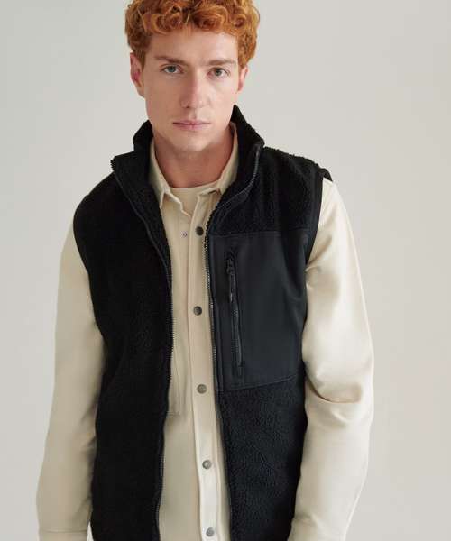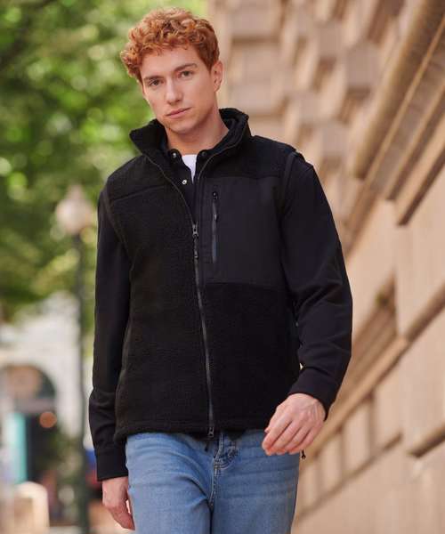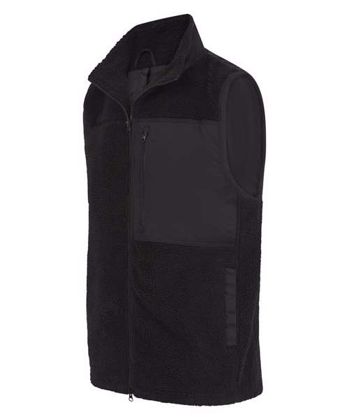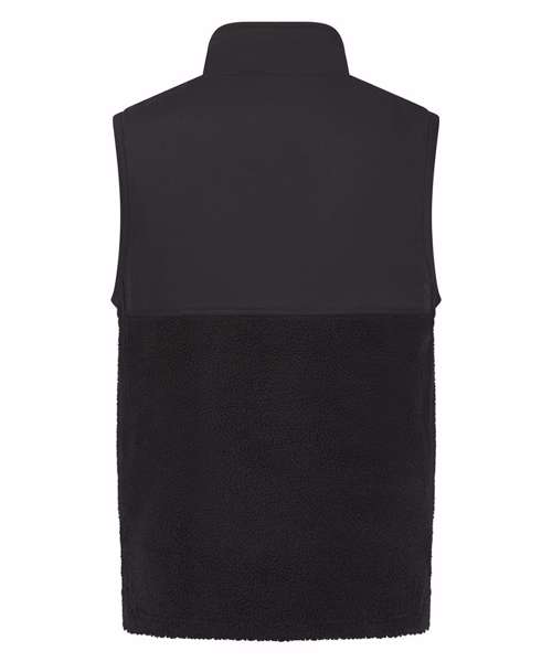 Zip-through recycled sherpa fleece gilet, regular fit. Lined with embroidery access. Contrast funnel collar, fleece inner. Flatlock stitched contrast panels – polyester/cotton twill. Front chest pocket with zip. Welt side pockets with popper fastening. Elasticated cuffs. Curved hem with elasticated cord. Tag-free for easy rebranding.
