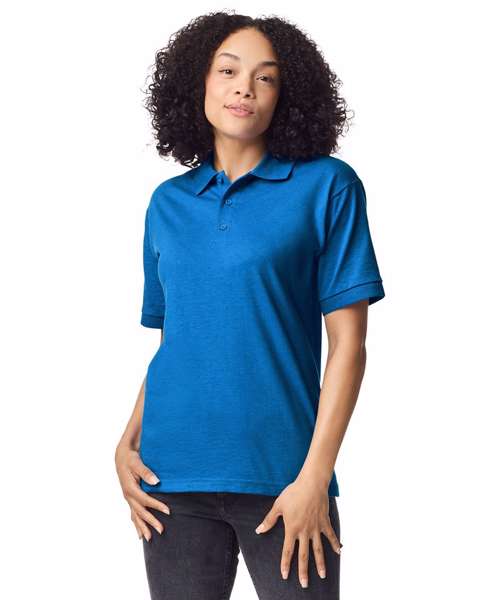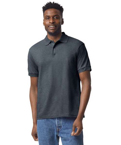 DryBlend® technology delivers moisture-wicking properties. Contoured welt collar and cuffs. Tearaway label. Clean finished placket with reinforced bottom box. 3 woodtone buttons. Twin-needle bottom hem.