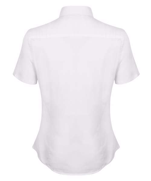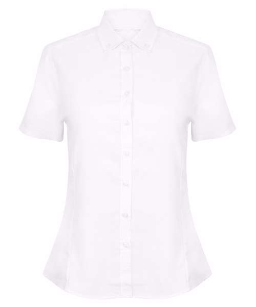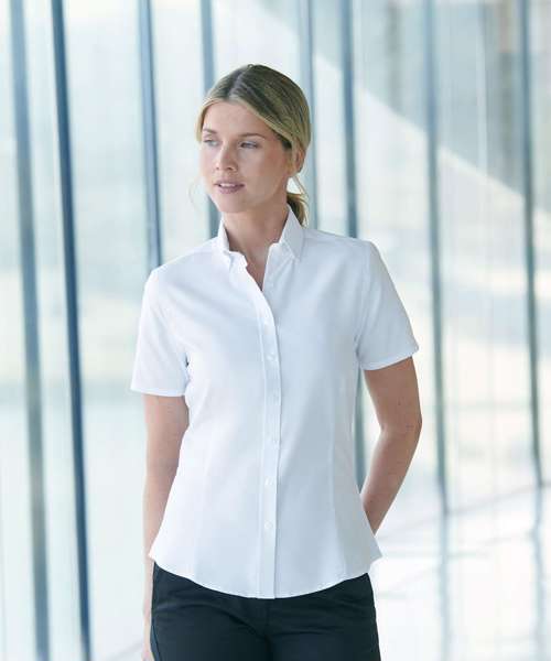 Women's modern fitted, button-down Oxford shirt. Cotton-rich lightweight Oxford with wrinkle resistant finish. Short point collar. Pearlised buttons.