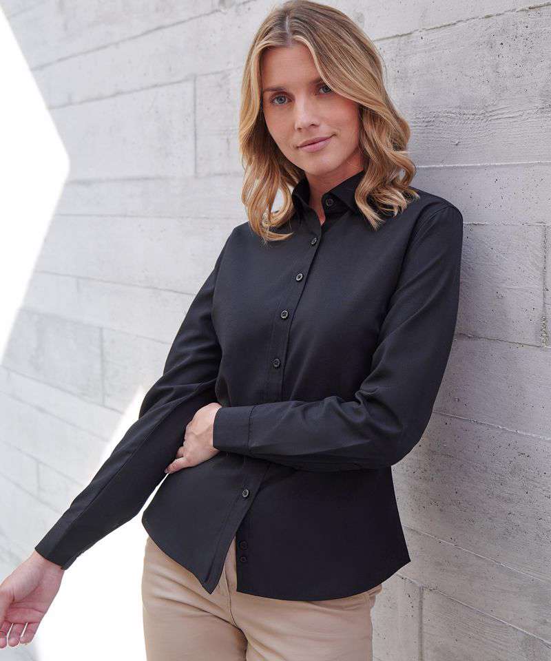 Women’s long sleeve ‘cotton-feel’ Coolplus® shirt, made from 100% Coolplus® permanent wicking fabric with cotton hand feel. Regular fit with shaped side seams. Front and back darts. Back yoke. Front placket with eight self-coloured pearlised buttons. Button-down collar. Adjustable cuffs. Tag-free. Wrinkle-resistant.