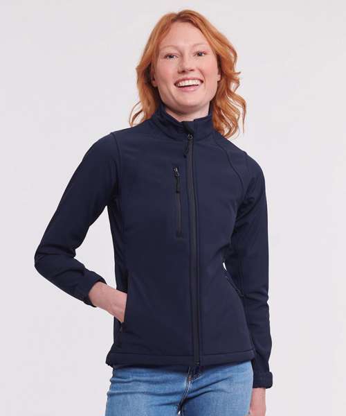 3 layer softshell fabric with breathable membrane and bonded microfleece lining, water resistant to 5000mm. Side pockets and chest pocket with inner lining, reversed zip and cord pulls. Full zip with inner storm flap and zip neck protector at collar. Bungee cord in hem. Adjustable cuffs. Drop tail. Feminine fit. Large left chest side decoration access. Fully launderable at 40°C.