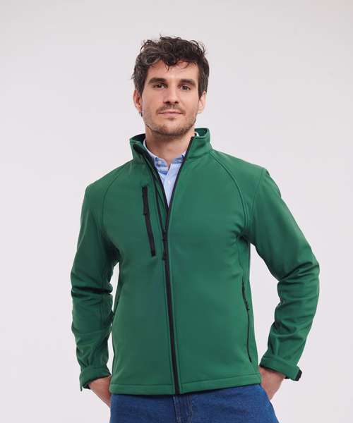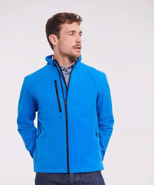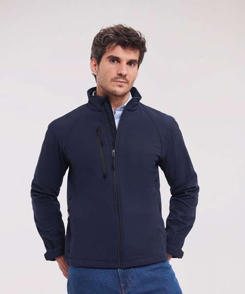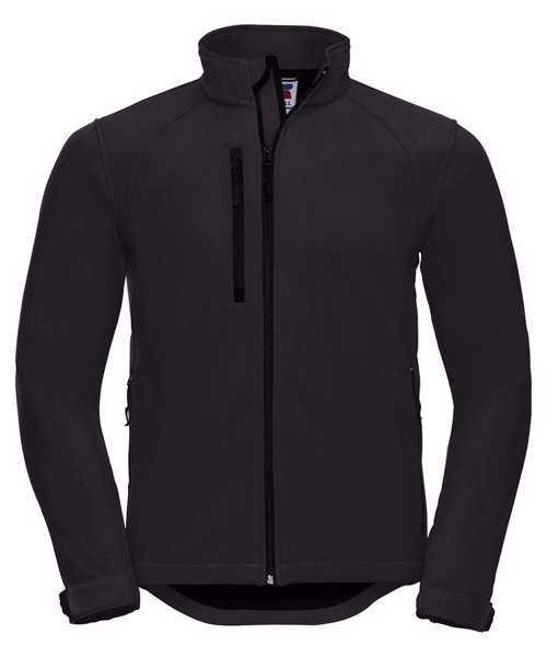 3 layer softshell fabric with breathable membrane and bonded microfleece lining, water resistant to 5000mm. Side pockets and chest pocket with inner lining, reversed zip and cord pulls. Full zip with inner storm flap and zip neck protector at collar. Bungee cord in hem. Adjustable cuffs. Drop tail. Large left chest side decoration access. Fully launderable at 40°C.