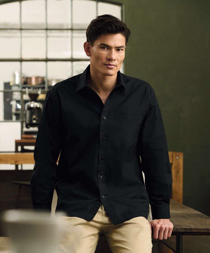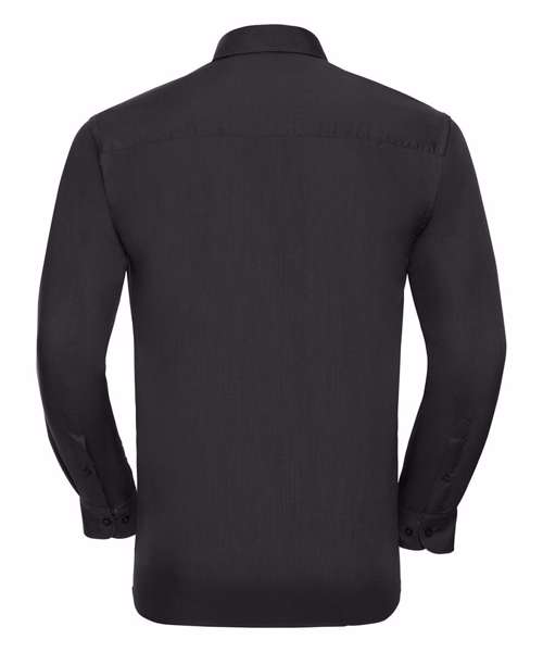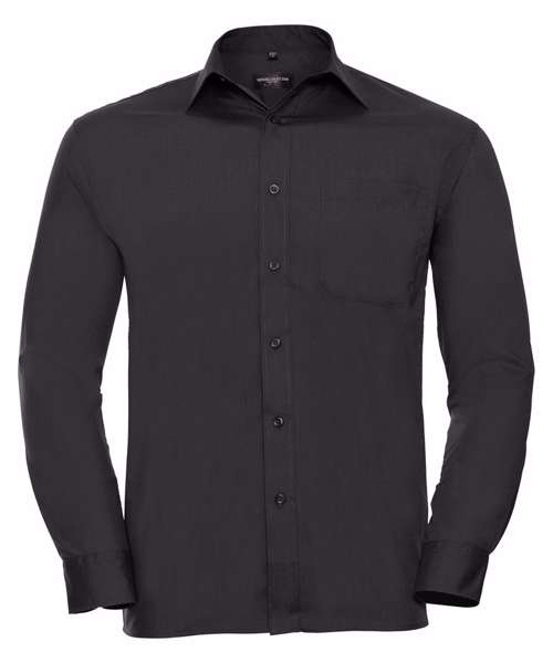 Smart and stylish shirt design in a fine poplin fabric. Classic style boned collar. Rounded 2 button adjustable cuff plus single button on cuff gauntlet. Back yoke with 2 side pleats. Pocket over left chest mitred edge. Straight bottom hem. The elegant lightweight fabric is especially suited to finer embroideries.