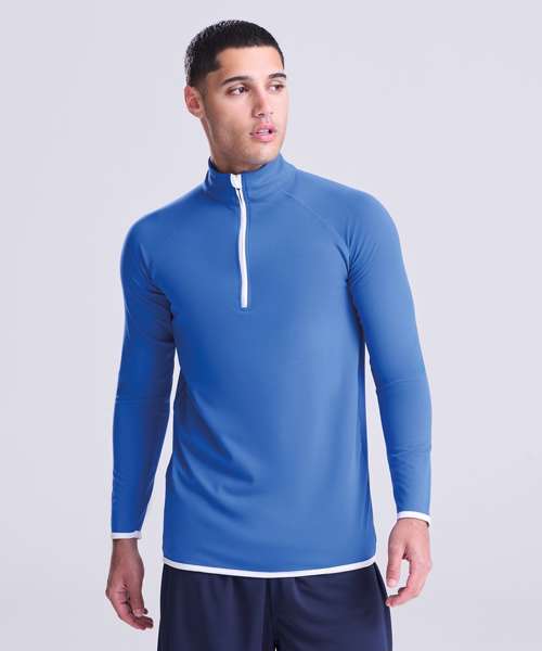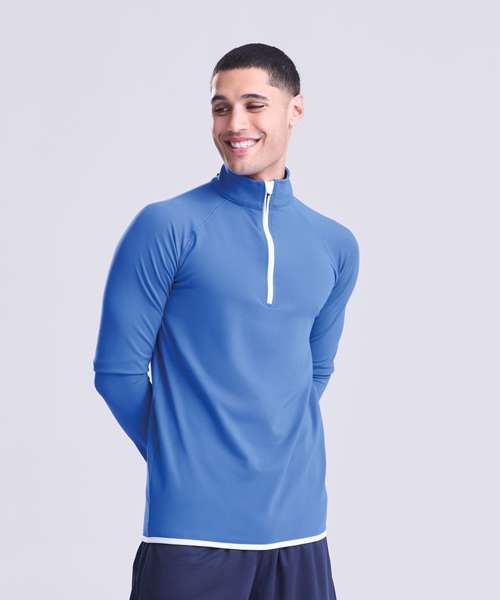 Stay warm and comfortable in this CoolFit ½ zip sweat which is ideal for layering. A tight fit with self-fabric, contrast colour binding at the zip, cuffs and hem. The raglan sleeves create ease of movement and there’s even a reflective tab on the back neck to help keep ear phone cords in place so you can listen to your favourite playlist to keep you motivated.
