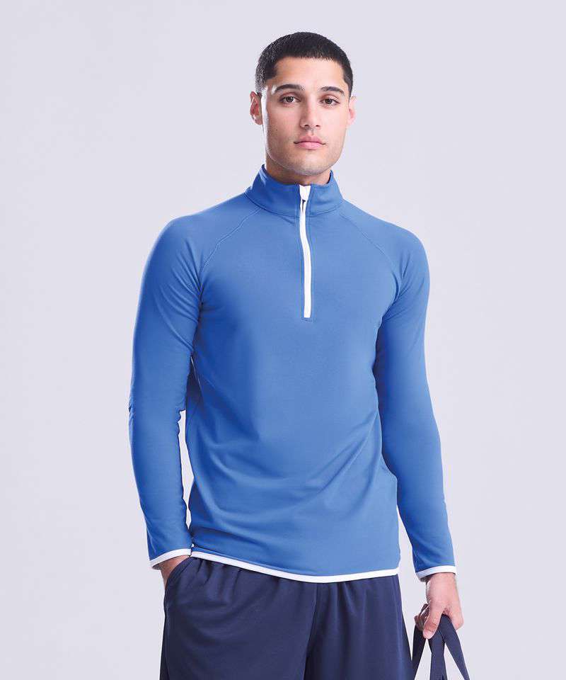 AWDis' own CoolFit blended fabric containing elastane that provides stretch for comfort and a great fit, tight fit, reflective tab on back of neck helps keep ear phone cords in place, self-fabric contrast colour binding at zip, cuffs and hem, raglan sleeve design creates ease of movement, ½ zip with stand-up collar for warmth, chin guard prevents irritation, simple tear off label makes it perfect for rebranding, UPF 30+ UV protection.