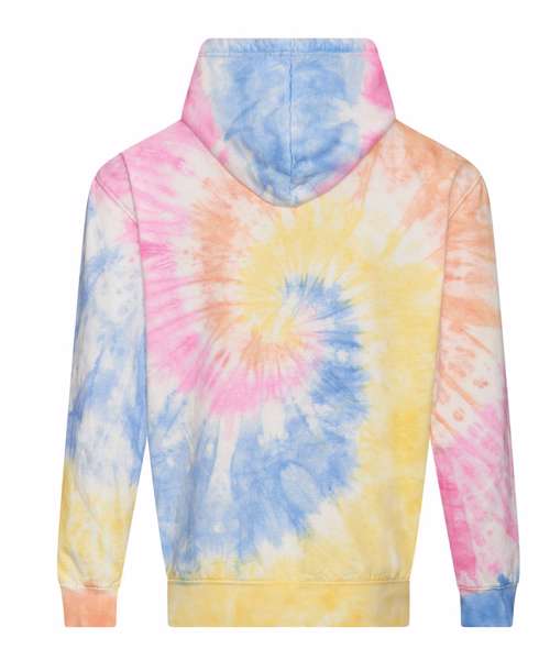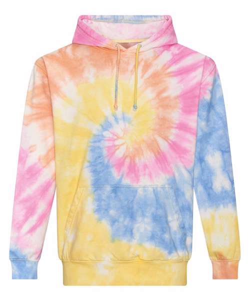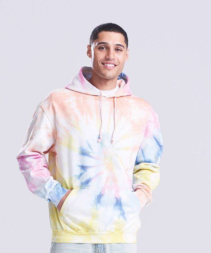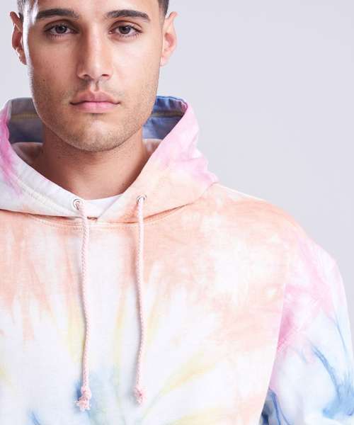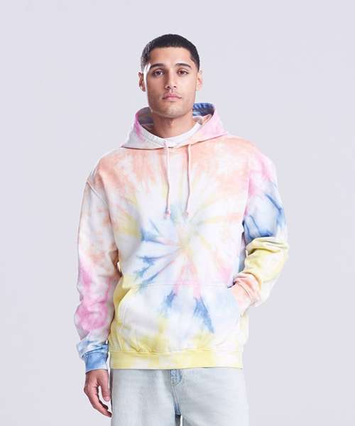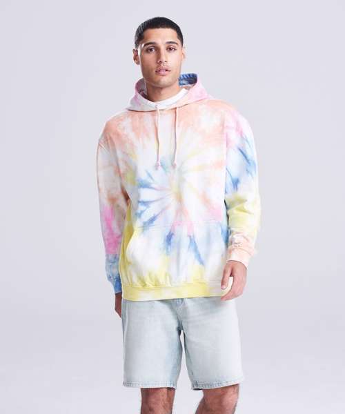 Relaxed fit. Twin-needle stitching detail. Double fabric hood with round drawcords. Kangaroo pouch pocket. Brushed inner fleece. Ribbed cuffs and hem. Tie-dye design. Every piece is unique. Size pip.