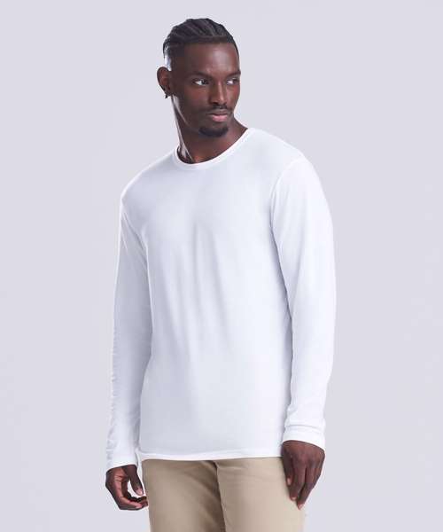 Modern fit long sleeved T. Size tab label. Triblend fabric for style and comfort. Taped neck. Twin-needle stitching on sleeves and bottom hem. Ribbed crew neck style. soft-feel fabric. Side seams. Set-in sleeves.
