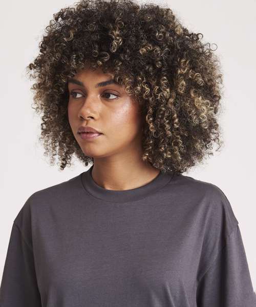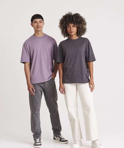 Oversized fit with side seams. Short sleeves. Ribbed crew neck style, with taped neck. Set-in sleeve. Size label only, for easy rebranding – colour-coded black for unisex. Combed ringspun cotton for ultra comfort. Surface excellent for print or embroidery. Twin-needle stitching detail on sleeves and bottom hem.