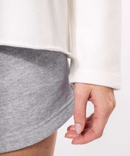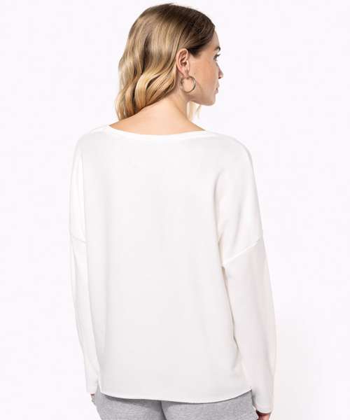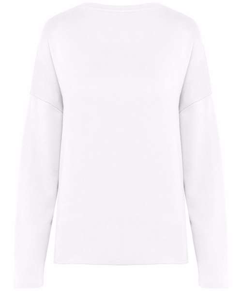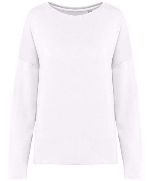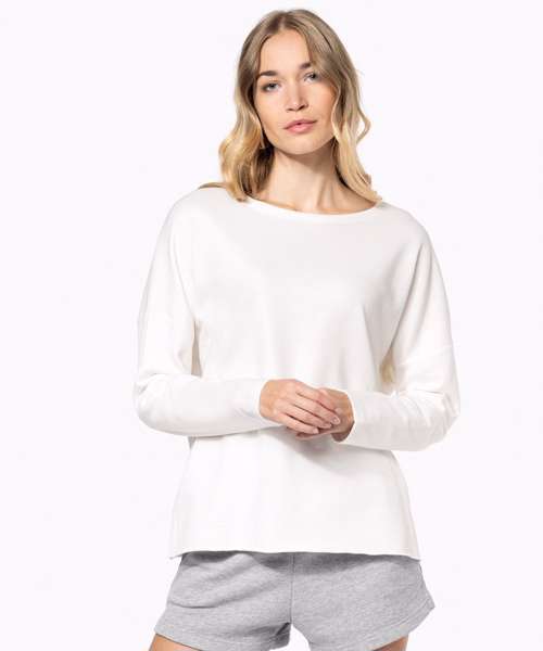 French terry. Ultra-soft fabric. Loose, relaxed fit with wide neck. Twill taped neck. Raw edge finish at hem. Twin-needle finishing at cuffs. No brand label at neck, only size tag for easy relabelling. BSCI certified. Oeko-Tex certified.