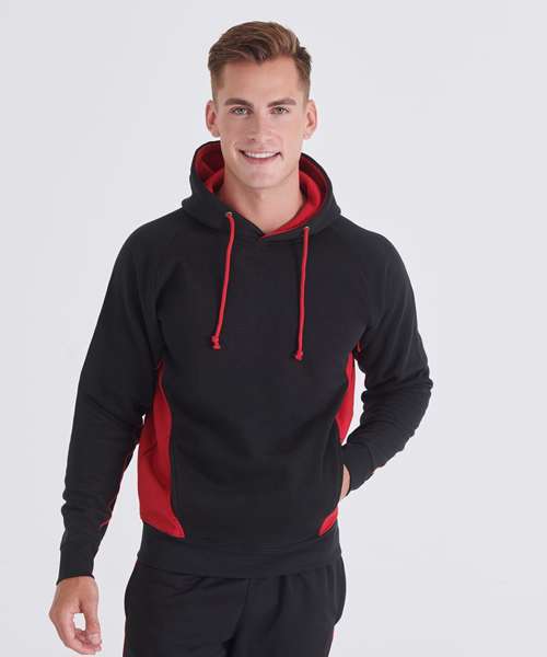 Make a statement in this stylish hoodie. Featuring contrast colour sleeve panels, a large kangaroo pocket and flat contrast drawcord, this style is both practical and on-trend.