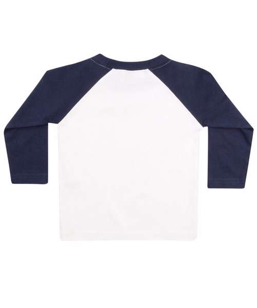 Long-sleeved baseball-style t-shirt with contrast sleeves and neck band. Twin needle stitching at hem and cuffs.