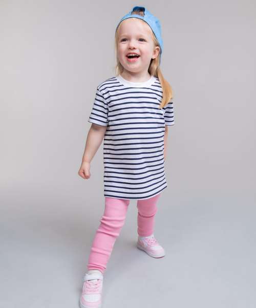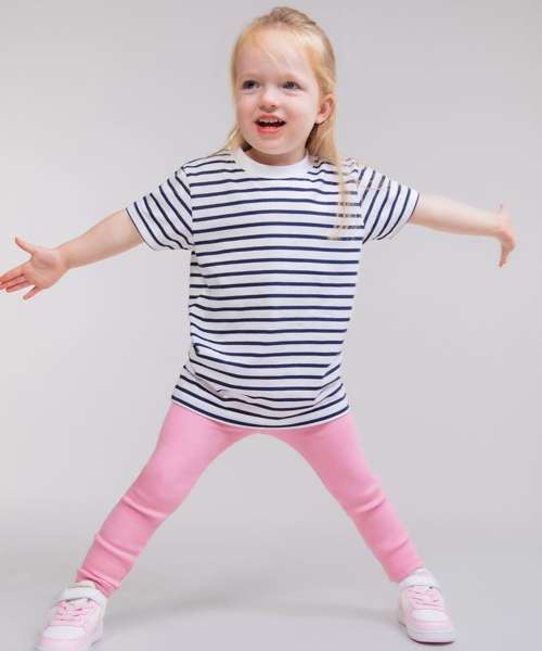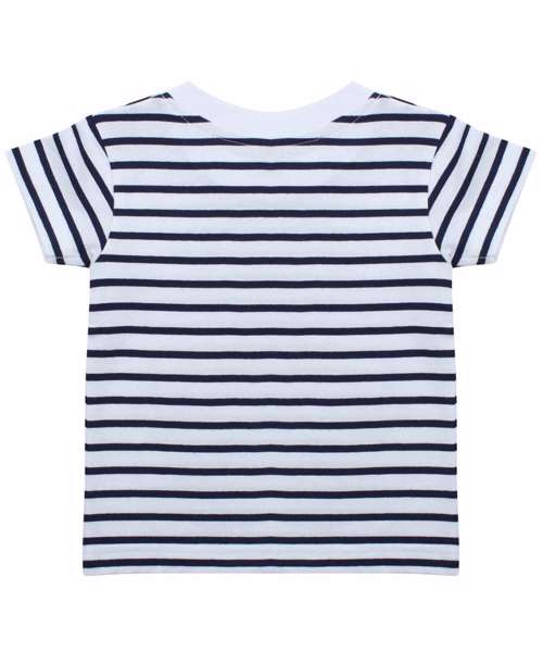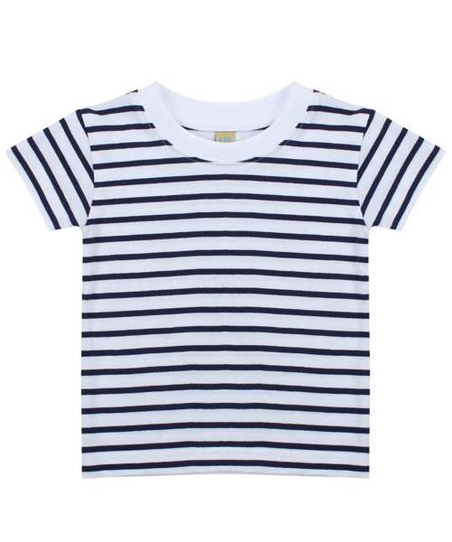 Short sleeved striped t-shirt with plain rib detail at neck. Set-in sleeves and twin needle stitching. Size tab only.