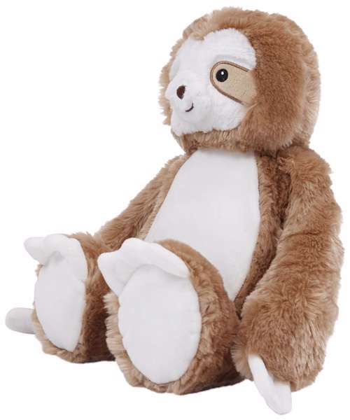 Soft plush Zippie Sloth with contrast face, hands, and feet. Sewn eyes and mouth. Hook and loop fastening on hands. White panel on tummy, perfect for decoration. Zip access on base for direct access onto the tummy for decoration. Removable inner stuffing. Can be embroidered, vinyl and sublimation printed. Complies with EN71 European Toy Safety regulations. Remove all hang tags and their fasteners before giving these items to a child. Suitable for all ages.