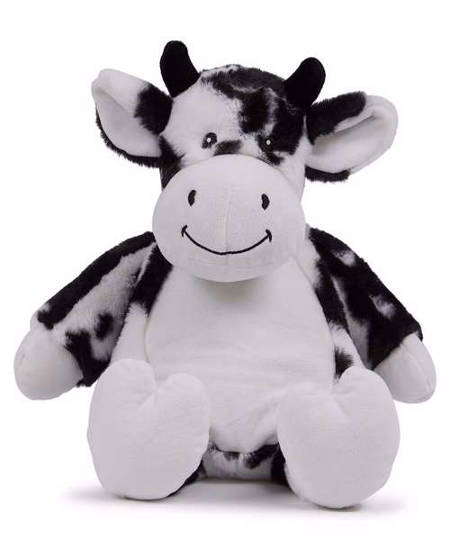 Soft plush Zippie cow with contrast face and hooves. Sewn eyes and mouth. White panel on tummy, perfect for decoration. Zip access on base for direct access onto the tummy for decoration. Removable, separate inner head and body stuffing. Can be embroidered, vinyl, and sublimation printed. Complies with EN71 European Toy Safety regulations. Remove all hang tags and their fasteners before giving this item to a child. Suitable for all ages.