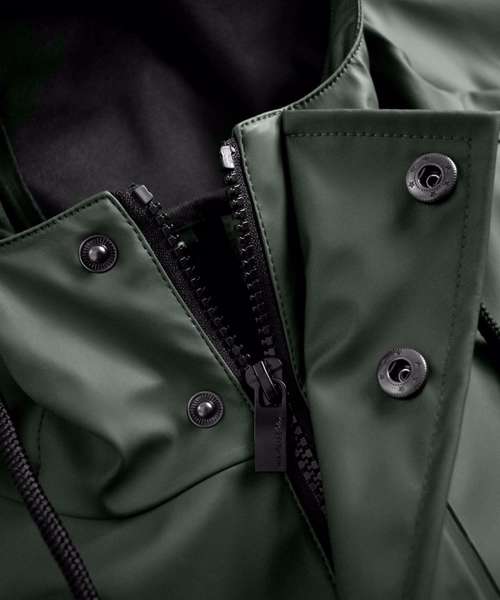 DETAILS: Waterproof. Welded seams. Quality main zip. Buttons on the front placket. Pockets and sleeve straps. Adjustable hood. Water-resistant.