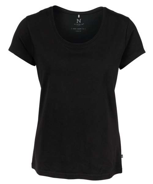 Slimming fit due to stretch fabric. Fashionable wide drop neck. Hemmed neck and sleeve detail. Combed organic cotton. Organic Content Standard 100 (OCS Certified, CU1038206).