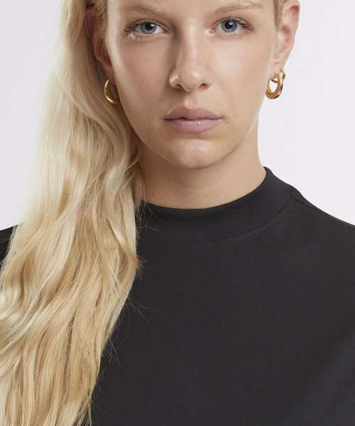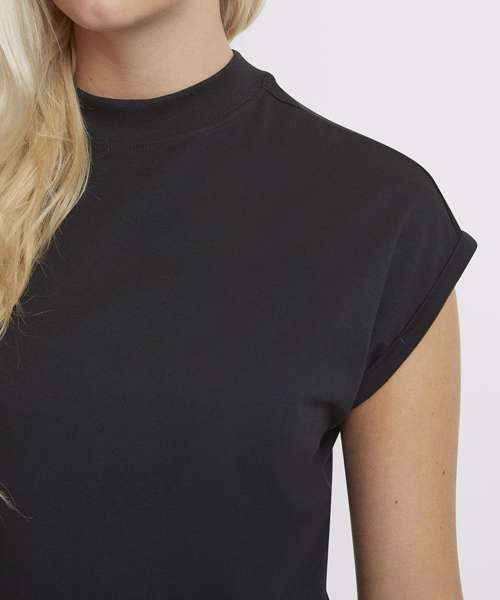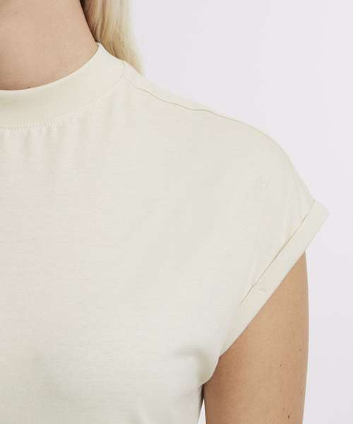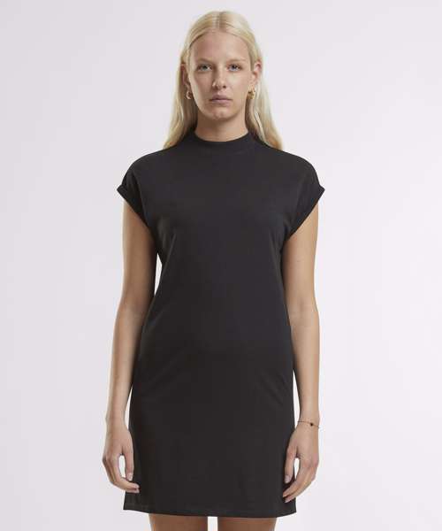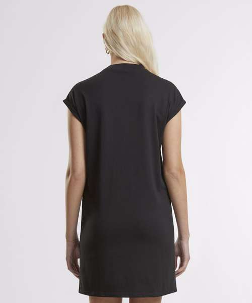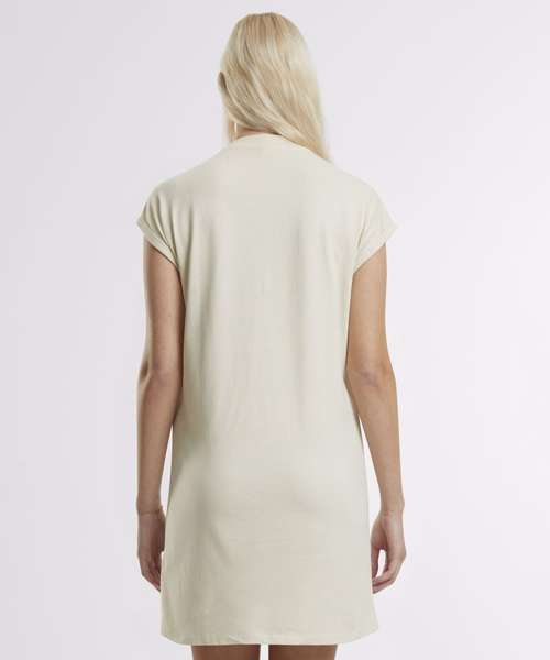 Effortless elegance with a relaxed fit. Chic round neckline for timeless style. Flattering thigh-length silhouette for confidence. Unique extended shoulder design adds flair. Simple yet sophisticated solid pattern dress. 100% Certified organic cotton.