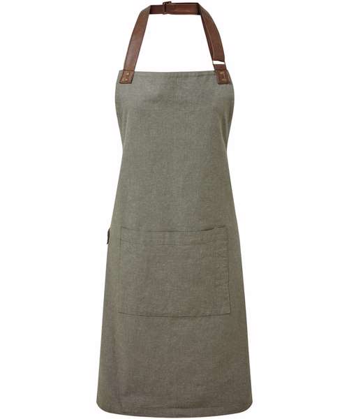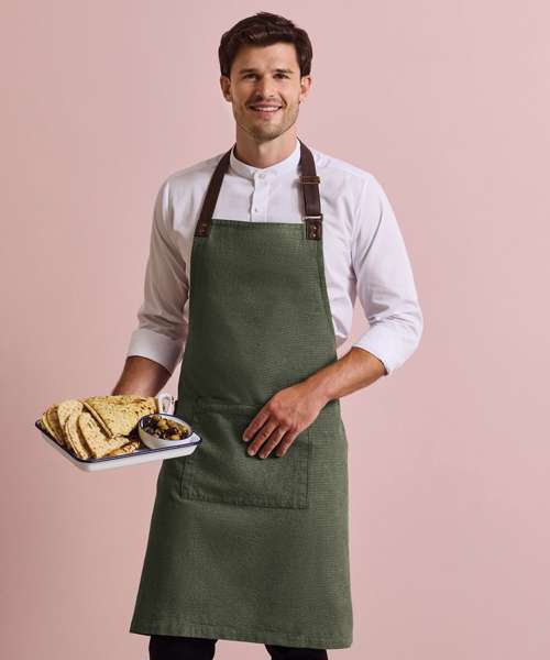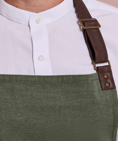 An attractive bib apron using yarn-dyed cotton threads that are woven together to create a pleasing contrast effect. To the centre lies a tablet-friendly pocket with combined pen pocket. A self-fabric tie can be looped through and secured in place using a double D-ring at the waist. Faux leather fabric features for decoration and practicality finish off this stunning apron.
