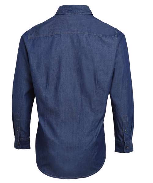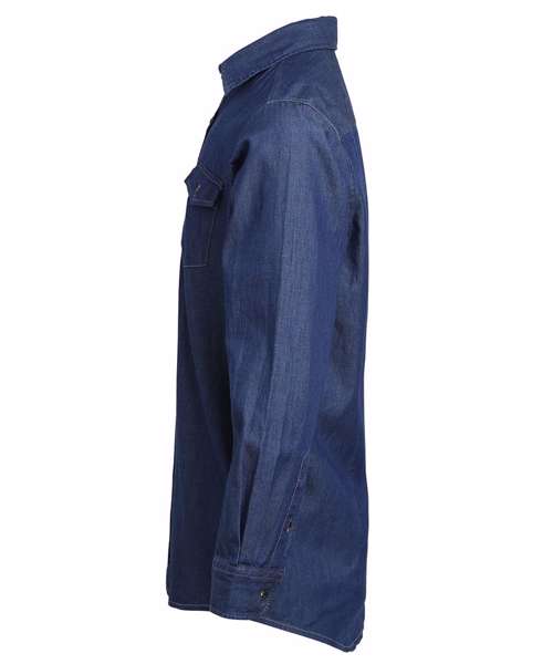 Long sleeve denim shirt with contrast stitch detail with left breast pocket. Buttoned cuff and sleeve guard. Curved hem. Back yoke.