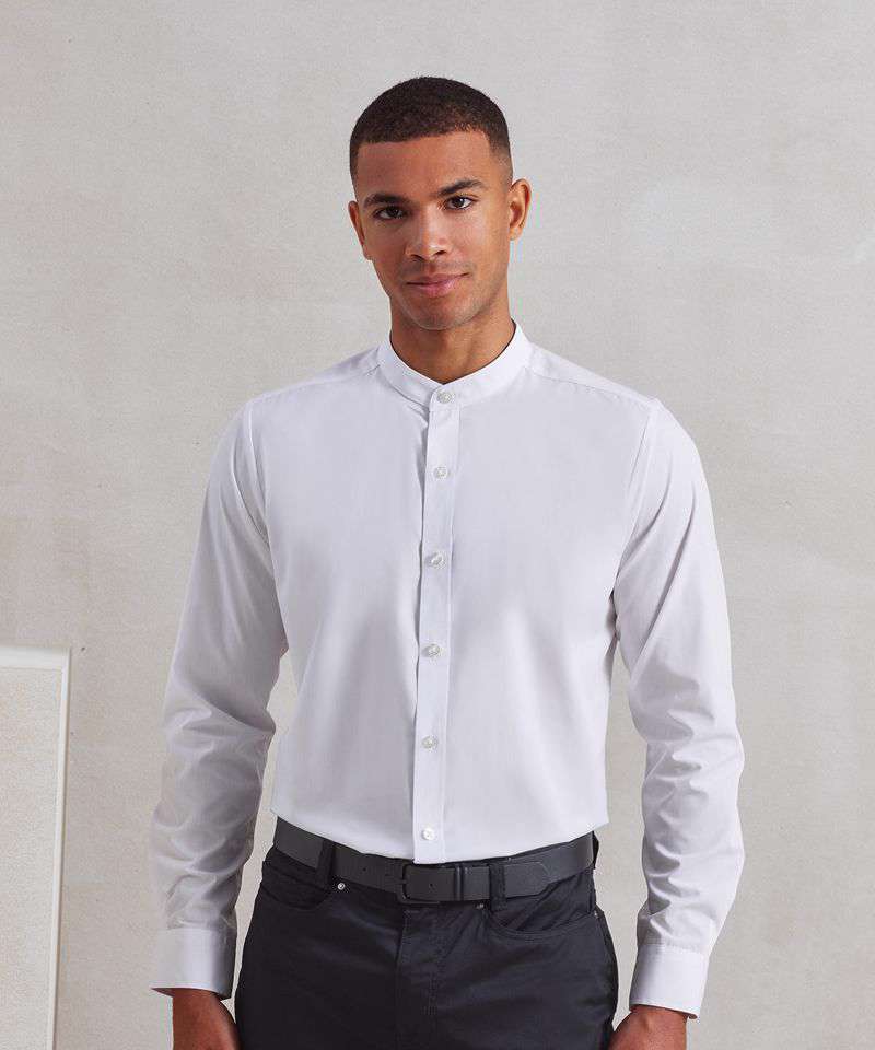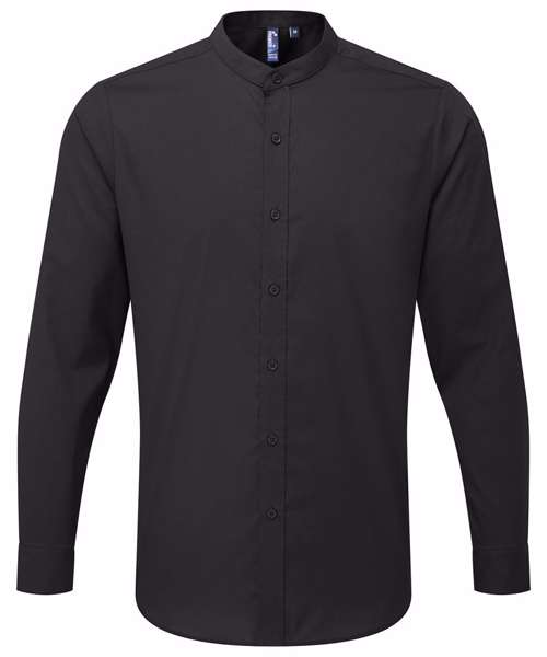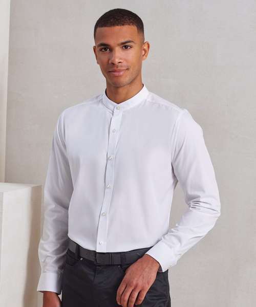 Long sleeve unisex shirt. Double button cuff and sleeve guard. Typical banded grandad collar with top button fastening. Easycare fabric.