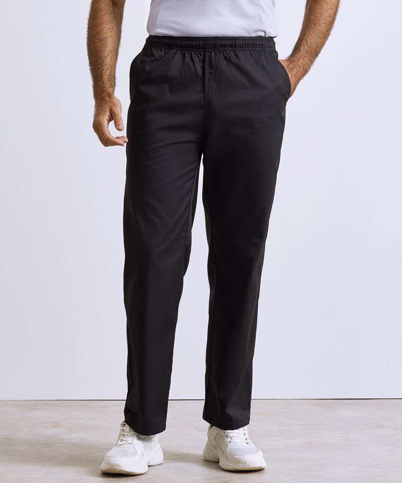 Unisex pull on chef’s trouser. Available in Black or White check or plain Black. Elasticated waist for easy pull on trouser. Unisex sizing. 30.5" inside leg. Side swing pockets. Drawcord.