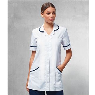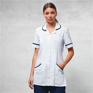 Healthcare tunic in easycare fabric. Rounded collar styling with contrast piped edge. Covered front zip fastening. Popper fastening above zip. Curved side pockets with contrast piped edge - 2 PU lined pen pockets. Side and back pleats for fitted styling. Contrast piped detail on sleeve cuff. Side vents. Made from Oeko-Tex® Standard 100 fabric. WRAP certified. BSCI certified. Reach certified. SEDEX certified.