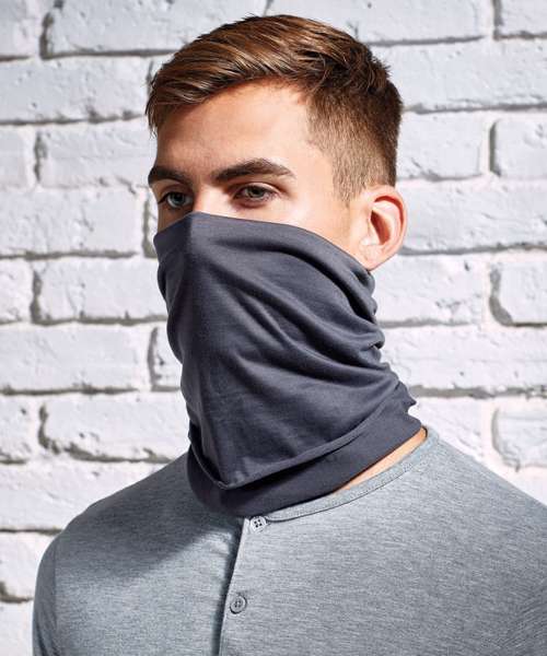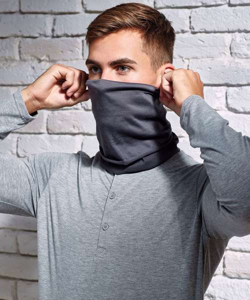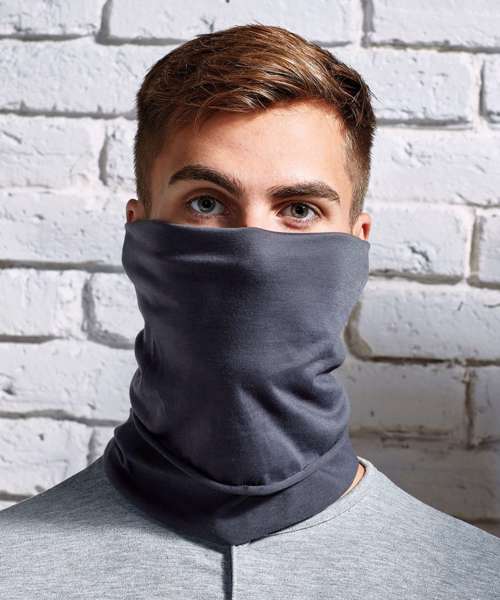Washable and reusable snood face covering, a light-weight, comfortable and breathable non-medical mask alternative. Seamless quick-drying fabric, secured by pulling over the face and double layering for a snug fit, featuring a Zelan™ R3 / Teflon EcoElite™ renewably sourced, durable water-repellent finish.
