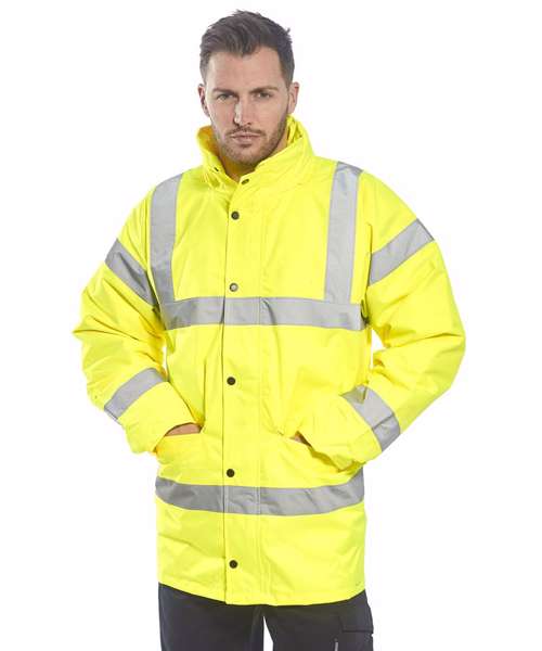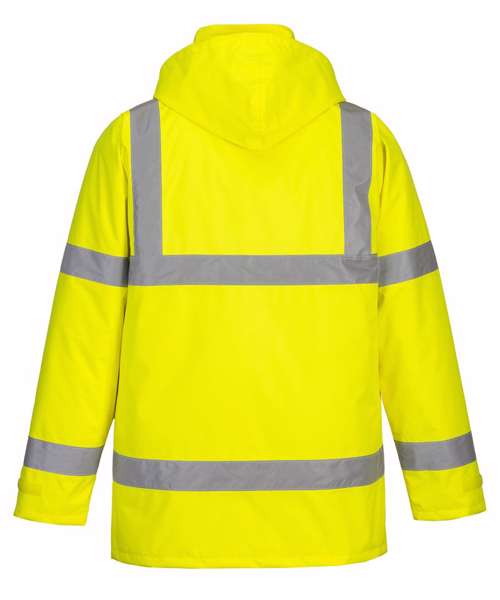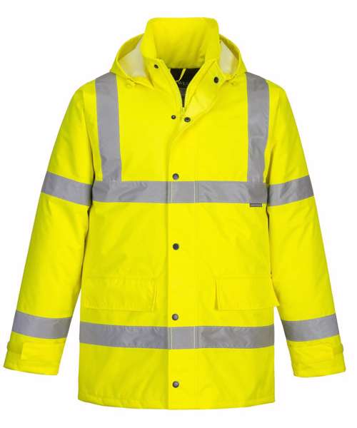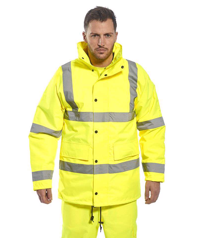 EN ISO 20471 Class 3, EN343 Class 3:1, EN342 standard. Two hip pockets with hook and loop fastened flaps. Drawstring hood. Knitted storm cuffs. Taped waterproof seams. Two-way zip front with studded storm flap. Inside pocket. Mobile phone pocket.