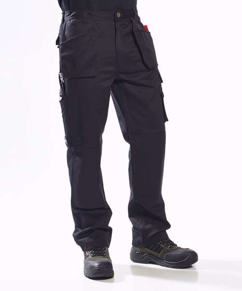 This rugged trouser is a fantastic addition to the Kit Solutions range. Constructed using our 300g Kingsmill fabric the Slate Trouser offers extra strength and abrasion resistance. Winning features include tuck away holster pockets knee pad pockets hammer loop and low profile branding. The mobile phone pocket is lined with anti shock fabric and will accommodate new smart phone dimensions.