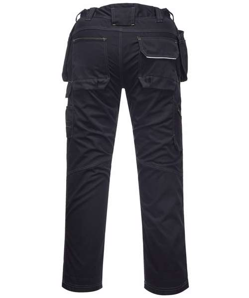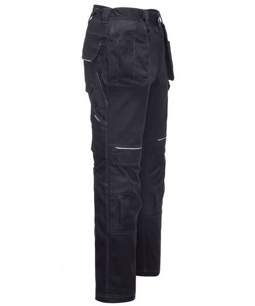 Contrast colour stitching. Contrast panels. Double rule pocket. Hammer loop. Reflective piping. Side pockets. Triple-stitched seams. Two back patch pockets. UPF 50+. Side elastic waist. Holster pockets. Gripper elastic on inner waist. Top-loading knee pad pockets. Smart phone pocket. D-ring. 12-pockets. Cargo pocket on side leg. Adjustable leg length. Reinforced panels . Durable polycotton fabric.