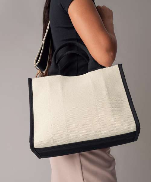 Zipped internal valuables pocket. Premium twill fabric. Structured design. Zipped main compartment. Hidden lining zip for easy decoration access. Internal foam padding. Internal baseboard. Soft-touch lining. Self-fabric edge trim. High-shine gold metal trims. Detachable, contrast, adjustable webbing shoulder strap. Self-fabric carry handles. TearAway label for ease of rebranding. Contains recycled polyester.