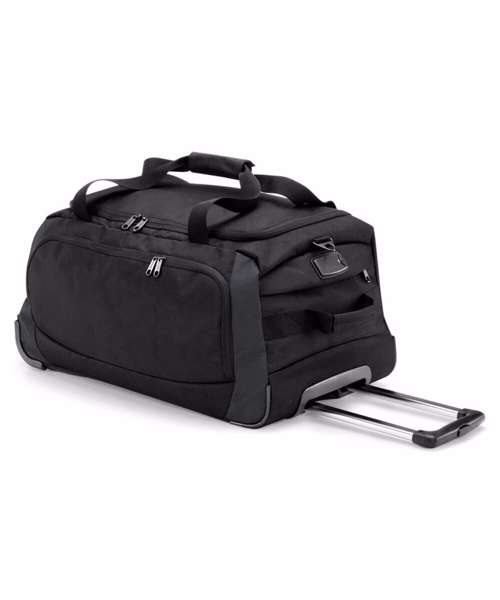 Zippered side pocket, multiple internal pockets. Detachable adjustable shoulder strap with pad. Haul handle. Padded hand grip. Retractable twin tube locking tow handle. Durable integrated skate wheels. Zippered front pocket. Padded handles. Covered name card holder.