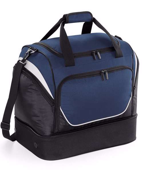 Designed to fit most lockers. Dual compartment design. Structured, ventilated base compartment. Front pocket designed for easy decoration. Zippered end pockets. Internal valuables pocket. Internal mesh pockets. Detachable adjustable shoulder strap with pad. Padded hand grip. Protective base feet.