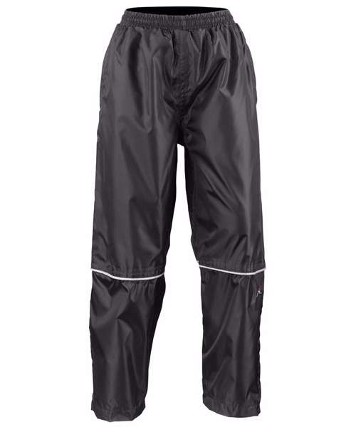 Ripstop waterproof (2000mm). Windproof. Cut for enhanced freedom of movement. Lower leg zip opening for easy access without removing shoes. 2 zip closing side pockets and 1 zip closing back pocket. Adjustable drawcord and elasticated waist. Reflective piping to lower leg incorporating reflective materials. Embroidered Result® sport logo to lower left leg. Fully taped waterproof seams. Concealed access for print and embroidery.Decoration Guidelines:Decorating methods: Embroidery, Direct print & Transfer print. Decorators access point: Open.