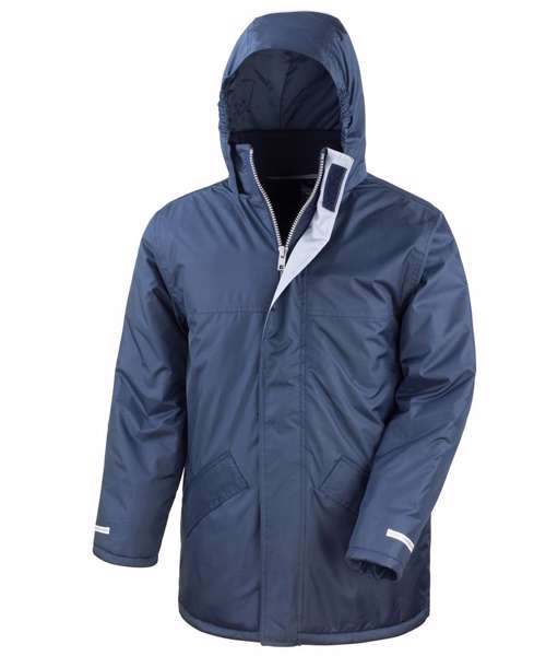 Waterproof-StormDri 2000. Windproof. Fully taped waterproof seams. Long fit. Super warm. Concealed 3-panel hood in collar. Full front heavy duty zip. 2 concealed front pockets with storm cover. Super warm fleece-lined collar. Reflective cuff and back detail. Name and class tag inside left pocket. Fleece-lined front pockets. Adjustable drawcord hem. Ready to brand cut cut-away label. Decorating methods: Embroidery, direct print, digital transfer print, and screen print transfer. Decorators access point: Full hem and left chest.