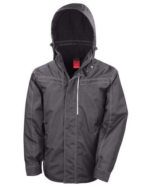 Tech: Waterproof 3000mm, Breathable 2000g, Windproof. Contrast twin needle stitching and bar tacks. Fashion shaped longer back panel. 4 outer and 2 inner zipped pockets. Quilted par-fleece lined. Stud closing storm flap. D-ring in LBP pocket. Tear release cuff. Removable hood. Taped seams. Reflective detail. Adjustable hem. Stand up collar. Hangtag. Rugged look. Hardwearing. Ready to brand – tag free. Corporate managers jacket styling.