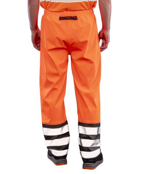 Soft and supple feel, heavier weight fabric. Contrast mesh front and back panels for breathability. White colour recycled backing. Waterproof welded seams. Prited safety leg bands. Snap closing ankles. Elasticated waist. Hang loop. Matches R507X safety jacket. EN ISO 20471:2013+A1:2016 Class 2. RIS-3279-TOM: ISSUE 2:2019 Class 2. EN343 3:1 Waterproof 5000mm, Breathable 1000mvp and Windproof.